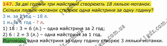 За дві години три майстрині створюють 18 ляльок-мотанок. Скільки ляльок-мотанок створює одна майстриня за одну годину? 3 м. за 2 год – 18 л. 1 м. за 1 год - ? л. 1) 18 : 3 = 6 (л.) – одна майстриня за 2 год; 2) 6 : 2 = 3 (л.) – одна майстриня за 1 год. Відповідь: одна майстриня за одну годину створює 3 ляльки-мотанки.
