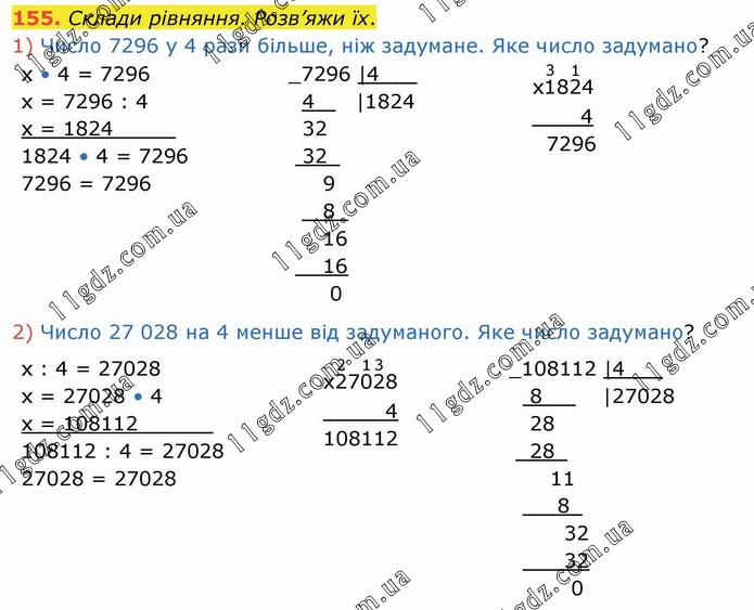 Склади рівняння. Розв’яжи їх. 1) Число 7296 у 4 рази більшe, ніж задумане. Яке число задумано? х • 4 = 7296 х = 7296 : 4 х = 1824_____ 1824 • 4 = 7296 7296 = 7296 2) Число 27 028 на 4 менше від задуманого. Яке число задумано? х : 4 = 27028 х = 27028 • 4 х = 108112______ 108112 : 4 = 27028 27028 = 27028
