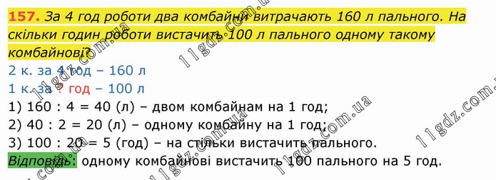 За 4 год роботи два комбайни витрачають 160 л пального. На скільки годин роботи вистачить 100 л пального одному такому комбайнові? 2 к. за 4 год – 160 л 1 к. за ? год – 100 л 1) 160 : 4 = 40 (л) – двом комбайнам на 1 год; 2) 40 : 2 = 20 (л) – одному комбайну на 1 год; 3) 100 : 20 = 5 (год) – на стільки вистачить пального. Відповідь: одному комбайнові вистачить 100 пального на 5 год.