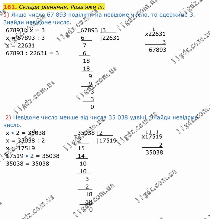 Склади рівняння. Розв’яжи їх. 1) Якщо число 67 893 поділити на невідоме число, то одержимо 3. Знайди невідоме число. 67893 : х = 3 х = 67893 : 3 х = 22631 67893 : 22631 = 3 2) Невідоме число менше від числа 35 038 удвічі. Знайди невідоме число. х • 2 = 35038 х = 35038 : 2 х = 17519 17519 • 2 = 35038 35038 = 35038