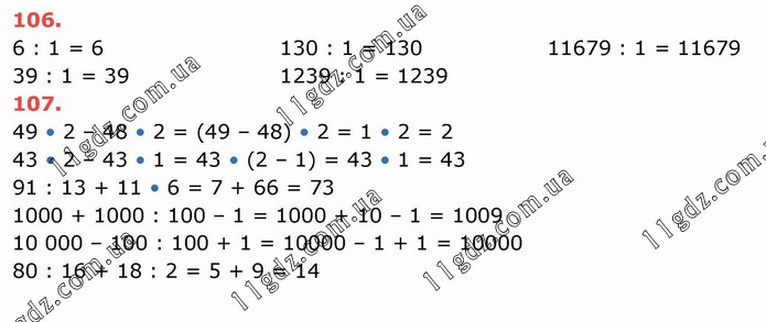 6 : 1 = 6 39 : 1 = 39 130 : 1 = 130 1239 : 1 = 1239 11679 : 1 = 11679 107. 49 • 2 – 48 • 2 = (49 – 48) • 2 = 1 • 2 = 2 43 • 2 – 43 • 1 = 43 • (2 – 1) = 43 • 1 = 43 91 : 13 + 11 • 6 = 7 + 66 = 73 1000 + 1000 : 100 – 1 = 1000 + 10 – 1 = 1009 10 000 – 100 : 100 + 1 = 10000 – 1 + 1 = 10000 80 : 16 + 18 : 2 = 5 + 9 = 14