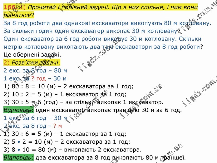 1) Прочитай і порівняй задачі. Що в них спільне, і чим вони різняться? За 8 год роботи два однакові екскаватори викопують 80 м котловану. За скільки годин один екскаватор викопає 30 м котловану? Один екскаватор за 6 год роботи викопує 30 м котловану. Скільки метрів котловану викопають два такі екскаватори за 8 год роботи? Це обернені задачі. 2) Розв’яжи задачі. 2 екс. за 8 год – 80 м 1 екс. за ? год – 30 м 1) 80 : 8 = 10 (м) – 2 екскаватора за 1 год; 2) 10 : 2 = 5 (м) – 1 екскаватор за 1 год; 3) 30 : 5 = 6 (год) – за стільки викопає 1 екскаватор. Відповідь: один екскаватор викопає траншею 30 м за 6 год. 1 екс. за 6 год – 30 м 2 екс. за 8 год - ? м 1) 30 : 6 = 5 (м) – 1 екскаватор за 1 год; 2) 5 • 2 = 10 (м) – 2 екскаватора за 1 год; 3) 8 • 10 = 80 (м) – викопають 2 екскаватора. Відповідь: два екскаватора за 8 год викопають 80 м траншеї.