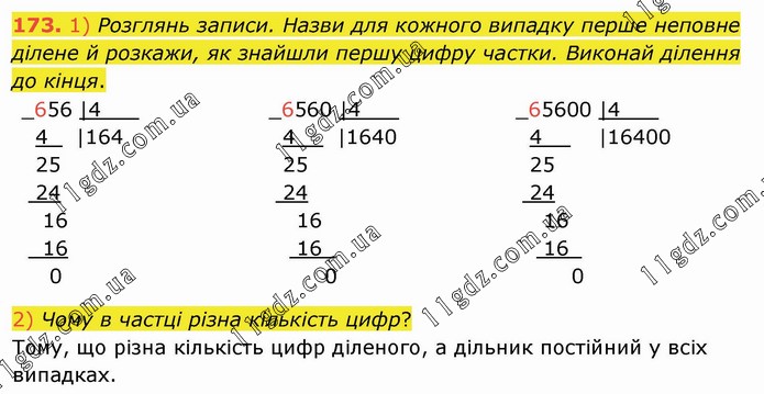 1) Розглянь записи. Назви для кожного випадку перше неповне ділене й розкажи, як знайшли першу цифру частки. Виконай ділення до кінця. 2) Чому в частці різна кількість цифр? Тому, що різна кількість цифр діленого, а дільник постійний у всіх випадках.