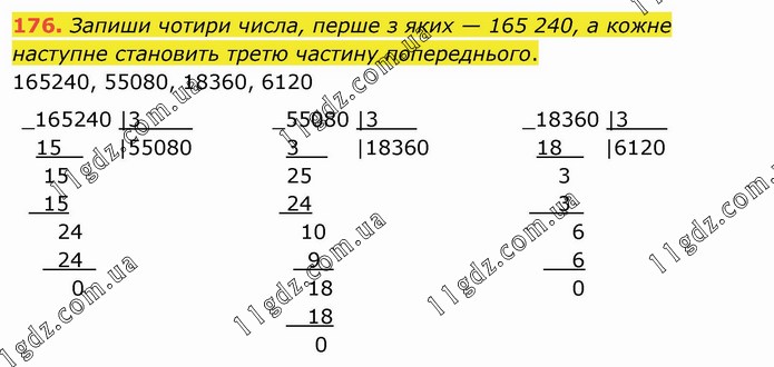 Запиши чотири числа, перше з яких — 165 240, а кожне наступне становить третю частину попереднього. 165240, 55080, 18360, 6120