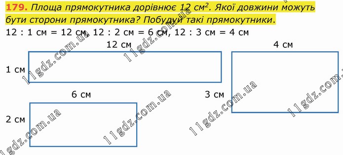 Площа прямокутника дорівнює 12 см2. Якої довжини можуть бути сторони прямокутника? Побудуй такі прямокутники. 12 : 1 см = 12 см, 12 : 2 см = 6 см, 12 : 3 см = 4 см