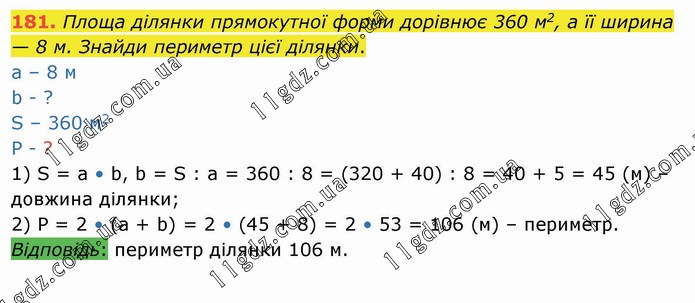 Площа ділянки прямокутної форми дорівнює 360 м2, а її ширина — 8 м. Знайди периметр цієї ділянки. а – 8 м b - ? S – 360 м2 Р - ? 1) S = a • b, b = S : a = 360 : 8 = (320 + 40) : 8 = 40 + 5 = 45 (м) – довжина ділянки; 2) Р = 2 • (а + b) = 2 • (45 + 8) = 2 • 53 = 106 (м) – периметр. Відповідь: периметр ділянки 106 м.