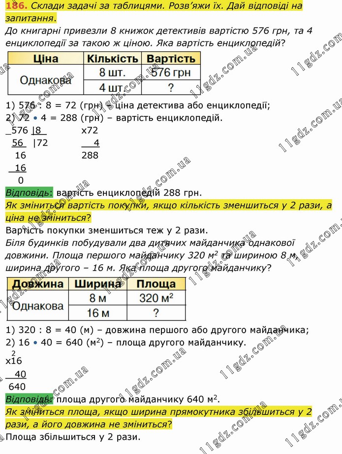 Склади задачі за таблицями. Розв’яжи їх. Дай відповіді на запитання. До книгарні привезли 8 книжок детективів вартістю 576 грн, та 4 енциклопедії за такою ж ціною. Яка вартість енциклопедій? 1) 576 : 8 = 72 (грн) – ціна детектива або енциклопедії; 2) 72 • 4 = 288 (грн) – вартість енциклопедій. Як зміниться вартість покупки, якщо кількість зменшиться у 2 рази, а ціна не зміниться? Вартість покупки зменшиться теж у 2 рази. Біля будинків побудували два дитячих майданчика однакової довжини. Площа першого майданчику 320 м2 та шириною 8 м, ширина другого – 16 м. Яка площа другого майданчику? 1) 320 : 8 = 40 (м) – довжина першого або другого майданчика; 2) 16 • 40 = 640 (м2) – площа другого майданчику. Як зміниться площа, якщо ширина прямокутника збільшиться у 2 рази, а його довжина не зміниться? Площа збільшиться у 2 рази.