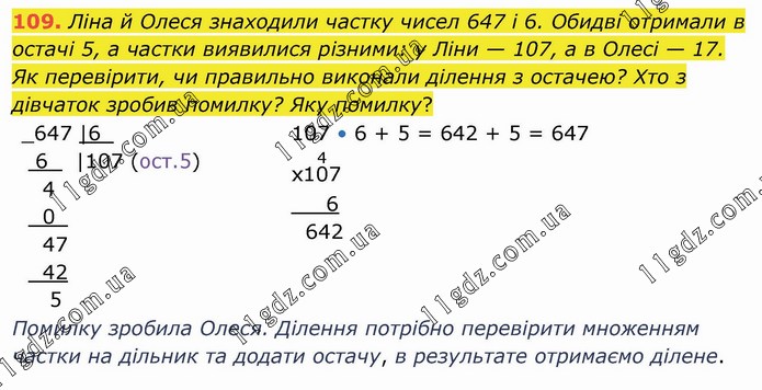 Ліна й Олеся знаходили частку чисел 647 і 6. Обидві отримали в остачі 5, а частки виявилися різними: у Ліни — 107, а в Олесі — 17. Як перевірити, чи правильно виконали ділення з остачею? Хто з дівчаток зробив помилку? Яку помилку?