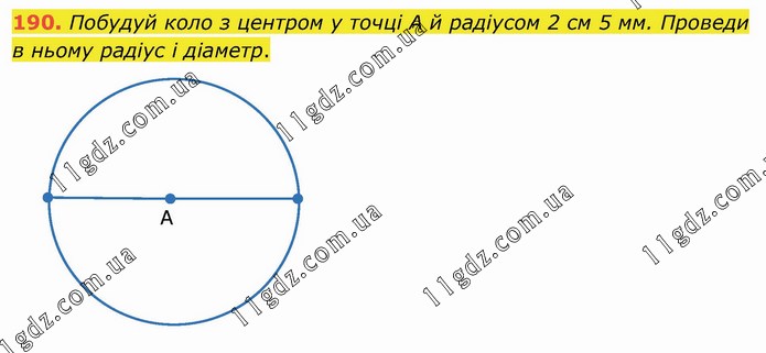 Побудуй коло з центром у точці А й радіусом 2 см 5 мм. Проведи в ньому радіус і діаметр.