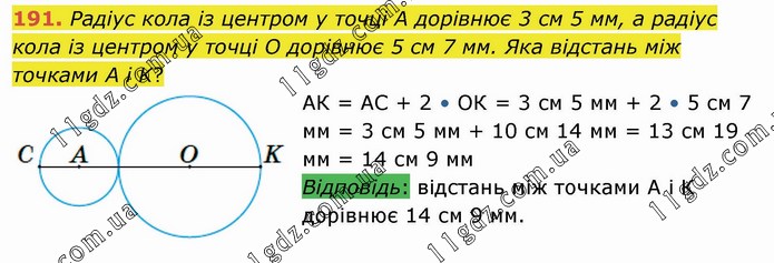 Радіус кола із центром у точці А дорівнює 3 см 5 мм, а радіус кола із центром у точці О дорівнює 5 см 7 мм. Яка відстань між точками А і K? АК = АС + 2 • ОК = 3 см 5 мм + 2 • 5 см 7 мм = 3 см 5 мм + 10 см 14 мм = 13 см 19 мм = 14 см 9 мм Відповідь: відстань між точками А і К дорівнює 14 см 9 мм.