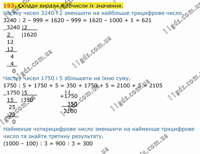 Склади вирази й обчисли їх значення. Частку чисел 3240 і 2 зменшити на найбільше трицифрове число. 3240 : 2 – 999 = 1620 – 999 = 1620 – 1000 + 1 = 621 Частку чисел 1750 і 5 збільшити на їхню суму. 1750 : 5 + 1750 + 5 = 350 + 1750 + 5 = 2100 + 5 = 2105 Найменше чотирицифрове число зменшити на найменше трицифрове число та знайти третину результату. (1000 – 100) : 3 = 900 : 3 = 300