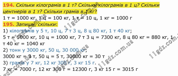 Скільки кілограмів в 1 т? Скільки кілограмів в 1 ц? Скільки центнерів в 1 т? Скільки грамів в 1 кг? 1 т = 1000 кг, 1 ц = 100 кг, 1 т = 10 ц, 1 кг = 1000 г 195. Запиши, скільки: 1) кілограмів у 5 т, 10 ц, 7 т 3 ц, 8 ц 80 кг, 1 т 40 кг; 5 т = 5000 кг, 10 ц = 1000 кг, 7 т 3 ц = 7300 кг, 8 ц 80 кг = 880 кг, 1 т 40 кг = 1040 кг 2) тонн у 3000 кг, 50 ц, 30 000 кг; 3000 кг = 3 т, 50 ц = 5 т, 30000 кг = 30 т 3) грамів у 7 кг, 12 кг 300 г, 3 кг 15 г. 7 кг = 7000 г, 12 кг 300 г = 12300 г, 3 кг 15 г = 3015 г