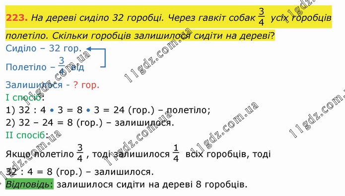 На дереві сиділо 32 горобці. Через гавкіт собак 34 усіх горобців полетіло. Скільки горобців залишилося сидіти на дереві? Сиділо – 32 гор. Полетіло – 3/4 від Залишилося - ? гор. І спосіб: 1) 32 : 4 • 3 = 8 • 3 = 24 (гор.) – полетіло; 2) 32 – 24 = 8 (гор.) – залишилося. ІІ спосіб: Якщо полетіло 3/4 , тоді залишилося 1/4 всіх горобців, тоді 32 : 4 = 8 (гор.) – залишилося. Відповідь: залишилося сидіти на дереві 8 горобців.