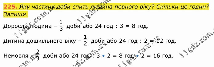 Яку частину доби спить людина певного віку? Скільки це годин? Запиши. Доросла людина – 1/3 доби або 24 год : 3 = 8 год. Дитина дошкільного віку – 1/2 доби або 24 год : 2 = 12 год. Немовля – 2/3 доби або 24 год : 3 • 2 = 8 год • 2 = 16 год.