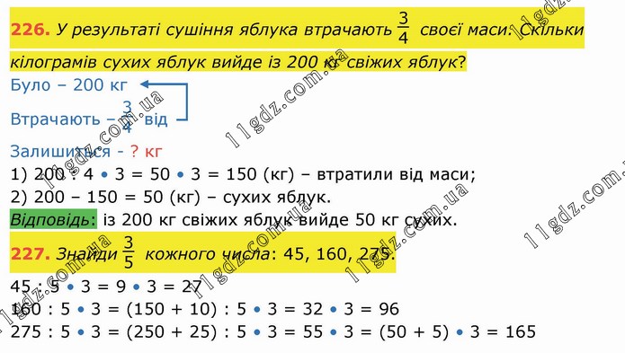 У результаті сушіння яблука втрачають 3/4 своєї маси. Скільки кілограмів сухих яблук вийде із 200 кг свіжих яблук? Було – 200 кг Втрачають – 3/4 від Залишиться - ? кг 1) 200 : 4 • 3 = 50 • 3 = 150 (кг) – втратили від маси; 2) 200 – 150 = 50 (кг) – сухих яблук. Відповідь: із 200 кг свіжих яблук вийде 50 кг сухих. 227. Знайди 3/5 кожного числа: 45, 160, 275. 45 : 5 • 3 = 9 • 3 = 27 160 : 5 • 3 = (150 + 10) : 5 • 3 = 32 • 3 = 96 275 : 5 • 3 = (250 + 25) : 5 • 3 = 55 • 3 = (50 + 5) • 3 = 165