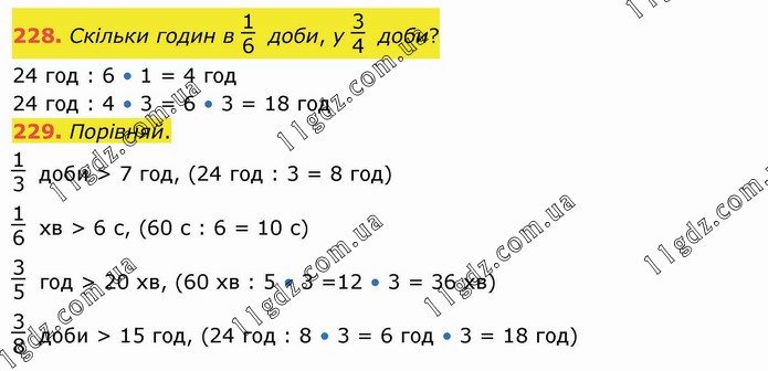 Скільки годин в 1/6 доби, у 3/4 доби? 24 год : 6 • 1 = 4 год 24 год : 4 • 3 = 6 • 3 = 18 год 229. Порівняй. 1/3 доби > 7 год, (24 год : 3 = 8 год) 1/6 хв > 6 с, (60 с : 6 = 10 с) 3/5 год > 20 хв, (60 хв : 5 • 3 =12 • 3 = 36 хв) 3/8 доби > 15 год, (24 год : 8 • 3 = 6 год • 3 = 18 год)