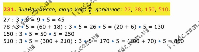 Знайди число, якщо його 3/5 дорівнює: 27, 78, 150, 510. 27 : 3 • 5 = 9 • 5 = 45 78 : 3 • 5 = (60 + 18) : 3 • 5 = 26 • 5 = (20 + 6) • 5 = 130 150 : 3 • 5 = 50 • 5 = 250 510 : 3 • 5 = (300 + 210) : 3 • 5 = 170 • 5 = (100 + 70) • 5 = 850