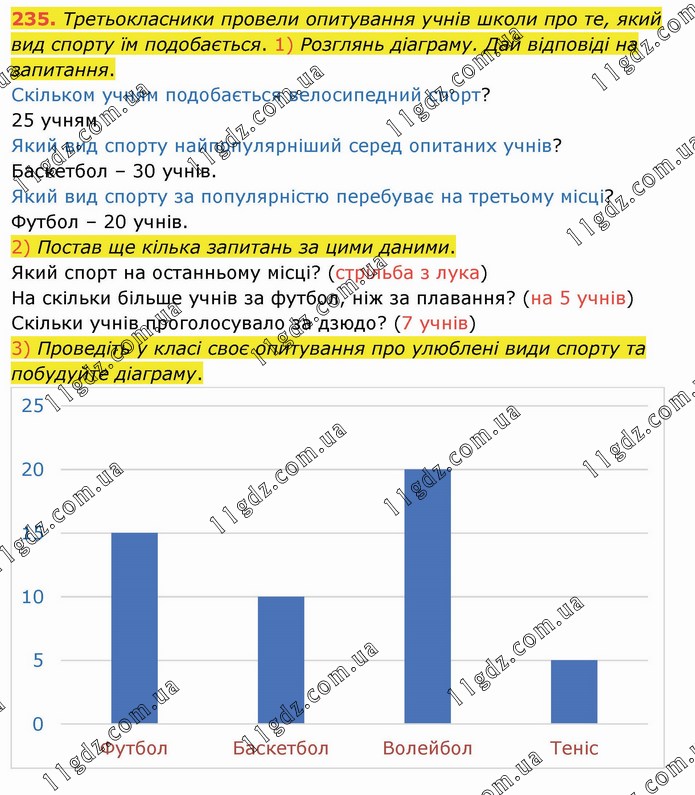 Третьокласники провели опитування учнів школи про те, який вид спорту їм подобається. 1) Розглянь діаграму. Дай відповіді на запитання. Скільком учням подобається велосипедний спорт? 25 учням Який вид спорту найпопулярніший серед опитаних учнів? Баскетбол – 30 учнів. Який вид спорту за популярністю перебуває на третьому місці? Футбол – 20 учнів. 2) Постав ще кілька запитань за цими даними. Який спорт на останньому місці? (стрільба з лука) На скільки більше учнів за футбол, ніж за плавання? (на 5 учнів) Скільки учнів проголосувало за дзюдо? (7 учнів) 3) Проведіть у класі своє опитування про улюблені види спорту та побудуйте діаграму.