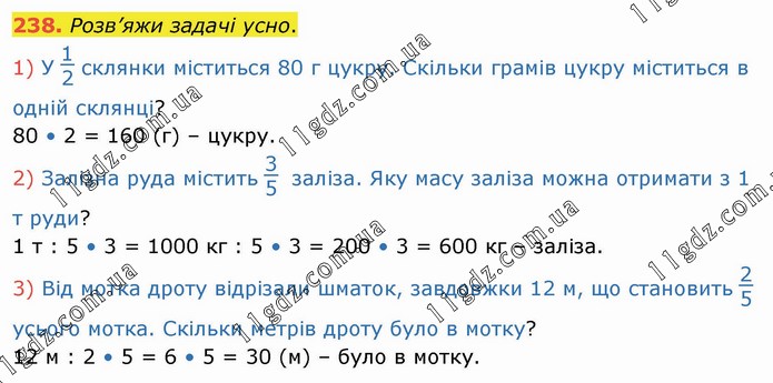 Розв’яжи задачі усно. 1) У 1/2 склянки міститься 80 г цукру. Скільки грамів цукру міститься в одній склянці? 80 • 2 = 160 (г) – цукру. 2) Залізна руда містить 3/5 заліза. Яку масу заліза можна отримати з 1 т руди? 1 т : 5 • 3 = 1000 кг : 5 • 3 = 200 • 3 = 600 кг – заліза. 3) Від мотка дроту відрізали шматок, завдовжки 12 м, що становить 2/5 усього мотка. Скільки метрів дроту було в мотку? 12 м : 2 • 5 = 6 • 5 = 30 (м) – було в мотку.