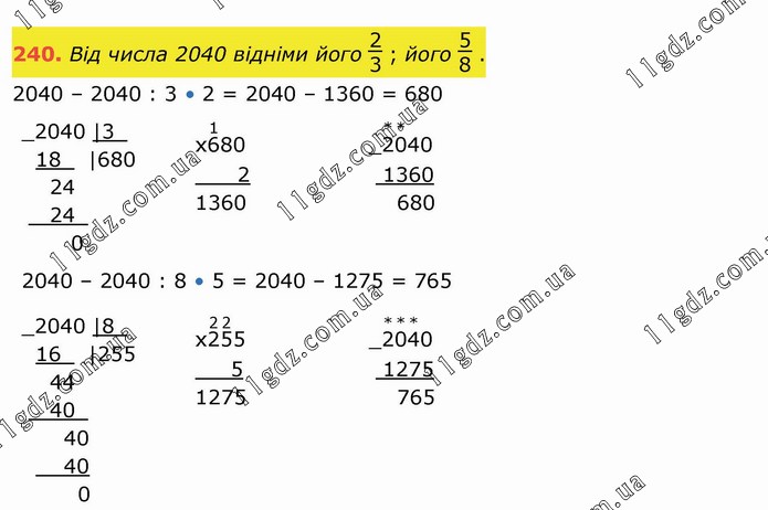 Від числа 2040 відніми його 2/3 ; його 5/8 . 2040 – 2040 : 3 • 2 = 2040 – 1360 = 680 2040 – 2040 : 8 • 5 = 2040 – 1275 = 765