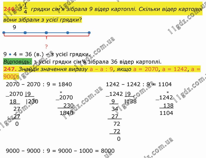 З 1/4 грядки сім’я зібрала 9 відер картоплі. Скільки відер картоплі вони зібрали з усієї грядки? 9 ? 9 • 4 = 36 (в.) – з усієї грядки. Відповідь: з усієї грядки сім’я зібрала 36 відер картоплі. 247. Знайди значення виразу а – а : 9, якщо а = 2070, а = 1242, а = 9000. 2070 – 2070 : 9 = 1840 1242 – 1242 : 9 = 1104