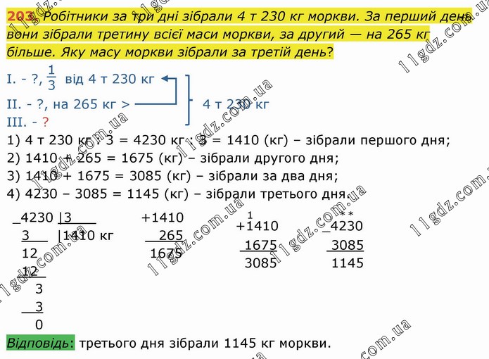 Робітники за три дні зібрали 4 т 230 кг моркви. За перший день вони зібрали третину всієї маси моркви, за другий — на 265 кг більше. Яку масу моркви зібрали за третій день? І. - ?, 13 від 4 т 230 кг ІІ. - ?, на 265 кг > 4 т 230 кг ІІІ. - ? 1) 4 т 230 кг : 3 = 4230 кг : 3 = 1410 (кг) – зібрали першого дня; 2) 1410 + 265 = 1675 (кг) – зібрали другого дня; 3) 1410 + 1675 = 3085 (кг) – зібрали за два дня; 4) 4230 – 3085 = 1145 (кг) – зібрали третього дня.