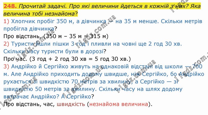 Прочитай задачі. Про які величини йдеться в кожній з них? Яка величина тобі незнайома? 1) Хлопчик пробіг 350 м, а дівчинка — на 35 м менше. Скільки метрів пробігла дівчинка? Про відстань. (350 м – 35 м = 315 м) 2) Туристи йшли пішки 3 год і пливли на човні ще 2 год 30 хв. Скільки часу туристи були в дорозі? Про час. (3 год + 2 год 30 хв = 5 год 30 хв.) 3) Андрійко й Сергійко живуть на однаковій відстані від школи — 700 м. Але Андрійко приходить додому швидше, ніж Сергійко, бо Андрійко рухається зі швидкістю 70 метрів за хвилину, а Сергійко — зі швидкістю 50 метрів за хвилину. Скільки часу на шлях додому витрачає Андрійко? А Сергійко? Про відстань, час, швидкість (незнайома величина).