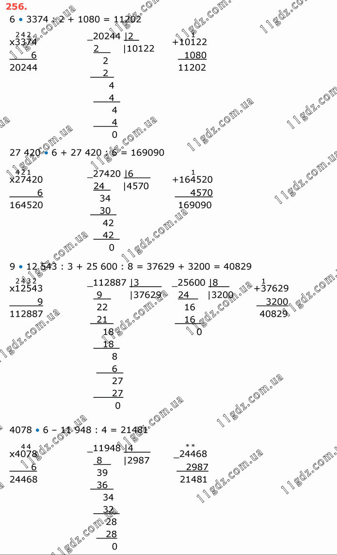 6 • 3374 : 2 + 1080 = 11202 27 420 • 6 + 27 420 : 6 = 169090 9 • 12 543 : 3 + 25 600 : 8 = 37629 + 3200 = 40829 4078 • 6 – 11 948 : 4 = 21481