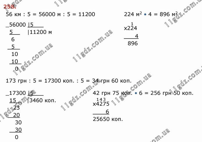 56 км : 5 = 56000 м : 5 = 11200 224 м2 • 4 = 896 м2 173 грн : 5 = 17300 коп. : 5 = 34 грн 60 коп.