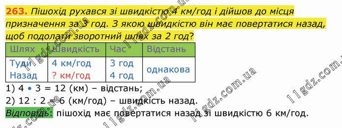 Пішохід рухався зі швидкістю 4 км/год і дійшов до місця призначення за 3 год. З якою швидкістю він має повертатися назад, щоб подолати зворотний шлях за 2 год? Шлях Швидкість Час Відстань Туди Назад 4 км/год ? км/год 3 год 4 год однакова 1) 4 • 3 = 12 (км) – відстань; 2) 12 : 2 = 6 (км/год) – швидкість назад. Відповідь: пішохід має повертатися назад зі швидкістю 6 км/год.
