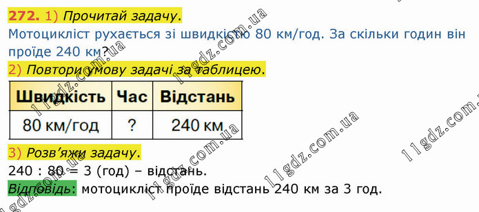 1) Прочитай задачу. Мотоцикліст рухається зі швидкістю 80 км/год. За скільки годин він проїде 240 км? 2) Повтори умову задачі за таблицею. 3) Розв’яжи задачу. 240 : 80 = 3 (год) – відстань. Відповідь: мотоцикліст проїде відстань 240 км за 3 год.