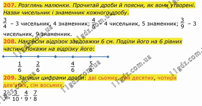 Розглянь малюнки. Прочитай дроби й поясни, як вони утворені. Назви чисельник і знаменник кожного дробу. 3/4 – 3 чисельник, 4 знаменник; 4/5 – 4 чисельник, 5 знаменник; 3/9 – 3 чисельник, 9 знаменник. 208. Накресли відрізок завдовжки 6 см. Поділи його на 6 рівних частин. Покажи на відрізку його: 1/6 2/6 4/6 5/6 209. Запиши цифрами дроби: дві сьомих, три десятих, чотири дев’ятих, сім восьмих.