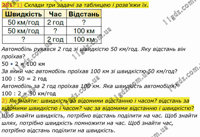 1) Склади три задачі за таблицею і розв’яжи їх. Автомобіль рухався 2 год зі швидкістю 50 км/год. Яку відстань він проїхав? 50 • 2 = 100 км За який час автомобіль проїхав 100 км зі швидкістю 50 км/год? 100 : 50 = 2 год Автомобіль за 2 год проїхав 100 км. Яка швидкість автомобіля? 100 : 2 = 50 км/год 2) Як знайти: швидкість за відомими відстанню і часом? відстань за відомими швидкістю і часом? час за відомими відстанню і швидкістю? Щоб знайти швидкість, потрібно відстань поділити на час. Щоб знайти шлях, потрібно швидкість помножити на час. Щоб знайти час, потрібно відстань поділити на швидкість.