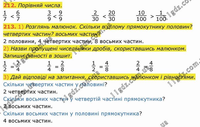 Порівняй числа. 1/7 < 6/7 3/9 < 9/9 2/30 < 20/30 10/100 > 1/100 213. 1) Розглянь малюнок. Скільки в цілому прямокутнику половин? четвертих частин? восьмих частин? 2 половини, 4 четвертих частин, 8 восьмих частин. 2) Назви пропущені чисельники дробів, скориставшись малюнком. Запиши рівності в зошит. 1/2 = 2/4 1/4 = 2/8 1/2 = 4/8 2/4 = 4/8 3) Дай відповіді на запитання, скориставшись малюнком і рівностями. Скільки четвертих частин у половині? 2 четвертих частин. Скільки восьмих частин у четвертій частині прямокутника? 2 восьмих частин. Скільки восьмих частин у половині прямокутника? 4 восьмих частин.