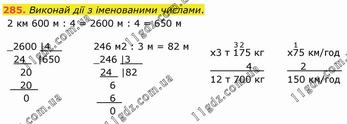 Виконай дії з іменованими числами. 2 км 600 м : 4 = 2600 м : 4 = 650 м