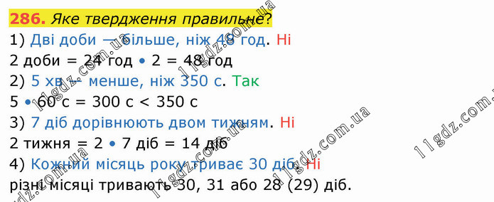 Яке твердження правильне? 1) Дві доби — більше, ніж 48 год. Ні 2 доби = 24 год • 2 = 48 год 2) 5 хв — менше, ніж 350 с. Так 5 • 60 с = 300 с < 350 с 3) 7 діб дорівнюють двом тижням. Ні 2 тижня = 2 • 7 діб = 14 діб 4) Кожний місяць року триває 30 діб. Ні різні місяці тривають 30, 31 або 28 (29) діб.