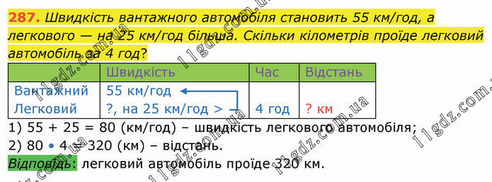 Швидкість вантажного автомобіля становить 55 км/год, а легкового — на 25 км/год більша. Скільки кілометрів проїде легковий автомобіль за 4 год? Швидкість Час Відстань Вантажний Легковий 55 км/год ?, на 25 км/год > 4 год ? км 1) 55 + 25 = 80 (км/год) – швидкість легкового автомобіля; 2) 80 • 4 = 320 (км) – відстань. Відповідь: легковий автомобіль проїде 320 км.
