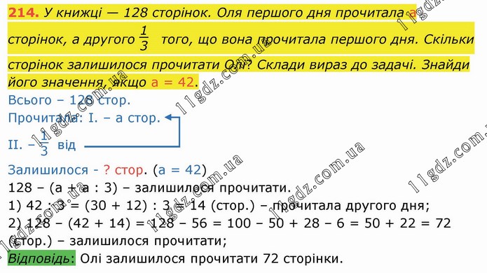 У книжці — 128 сторінок. Оля першого дня прочитала а сторінок, а другого 1/3 того, що вона прочитала першого дня. Скільки сторінок залишилося прочитати Олі? Склади вираз до задачі. Знайди його значення, якщо а = 42. Всього – 128 стор. Прочитала: І. – а стор. ІІ. – 13 від Залишилося - ? стор. (а = 42) 128 – (а + а : 3) – залишилося прочитати. 1) 42 : 3 = (30 + 12) : 3 = 14 (стор.) – прочитала другого дня; 2) 128 – (42 + 14) = 128 – 56 = 100 – 50 + 28 – 6 = 50 + 22 = 72 (стор.) – залишилося прочитати; Відповідь: Олі залишилося прочитати 72 сторінки.