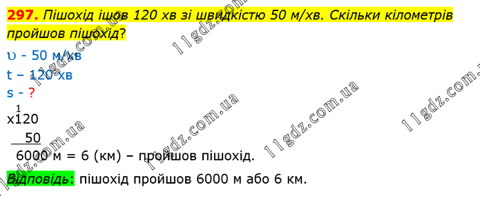 Пішохід ішов 120 хв зі швидкістю 50 м/хв. Скільки кілометрів пройшов пішохід? 120 • 50 = 6000 м = 6 (км) – пройшов пішохід. Відповідь: пішохід пройшов 6000 м або 6 км.