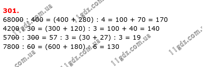 68000 : 400 = (400 + 280) : 4 = 100 + 70 = 170 4200 : 30 = (300 + 120) : 3 = 100 + 40 = 140 5700 : 300 = 57 : 3 = (30 + 27) : 3 = 19 7800 : 60 = (600 + 180) : 6 = 130