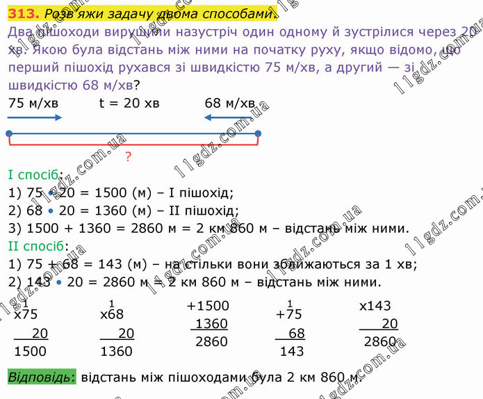 Розв’яжи задачу двома способами. Два пішоходи вирушили назустріч один одному й зустрілися через 20 хв. Якою була відстань між ними на початку руху, якщо відомо, що перший пішохід рухався зі швидкістю 75 м/хв, а другий — зі швидкістю 68 м/хв? 75 м/хв t = 20 хв 68 м/хв ? І спосіб: 1) 75 • 20 = 1500 (м) – І пішохід; 2) 68 • 20 = 1360 (м) – ІІ пішохід; 3) 1500 + 1360 = 2860 м = 2 км 860 м – відстань між ними. ІІ спосіб: 1) 75 + 68 = 143 (м) – на стільки вони зближаються за 1 хв; 2) 143 • 20 = 2860 м = 2 км 860 м – відстань між ними.