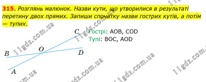Розглянь малюнок. Назви кути, що утворилися в результаті перетину двох прямих. Запиши спочатку назви гострих кутів, а потім — тупих. Гострі: АОВ, COD Тупі: BOC, AOD