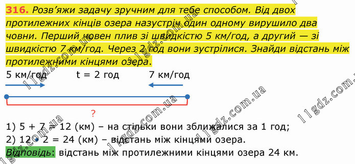 Розв’яжи задачу зручним для тебе способом. Від двох протилежних кінців озера назустріч один одному вирушило два човни. Перший човен плив зі швидкістю 5 км/год, а другий — зі швидкістю 7 км/год. Через 2 год вони зустрілися. Знайди відстань між протилежними кінцями озера. 5 км/год t = 2 год 7 км/год ? 1) 5 + 7 = 12 (км) – на стільки вони зближалися за 1 год; 2) 12 • 2 = 24 (км) – відстань між кінцями озера. Відповідь: відстань між протилежними кінцями озера 24 км.