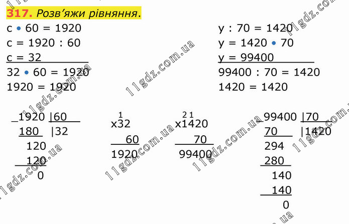 Розв’яжи рівняння. с • 60 = 1920 с = 1920 : 60 с = 32_______ 32 • 60 = 1920 1920 = 1920 у : 70 = 1420 у = 1420 • 70 у = 99400______ 99400 : 70 = 1420 1420 = 1420