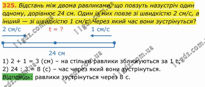 Відстань між двома равликами, що повзуть назустріч один одному, дорівнює 24 см. Один із них повзе зі швидкістю 2 см/с, а інший — зі швидкістю 1 см/с. Через який час вони зустрінуться? 2 см/с t = ? 1 см/с 24 см 1) 2 + 1 = 3 (см) – на стільки равлики зближуються за 1 с; 2) 24 : 3 = 8 (с) – час через який вони зустрінуться. Відповідь: равлики зустрінуться через 8 с.