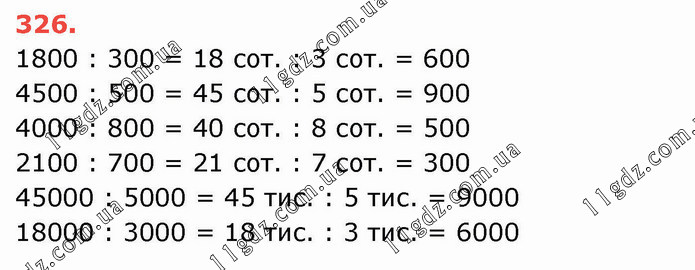 1800 : 300 = 18 сот. : 3 сот. = 600 4500 : 500 = 45 сот. : 5 сот. = 900 4000 : 800 = 40 сот. : 8 сот. = 500 2100 : 700 = 21 сот. : 7 сот. = 300 45000 : 5000 = 45 тис. : 5 тис. = 9000 18000 : 3000 = 18 тис. : 3 тис. = 6000