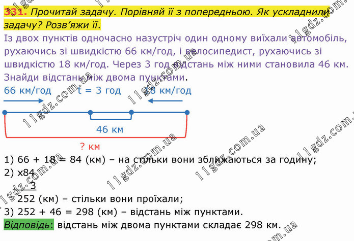 Прочитай задачу. Порівняй її з попередньою. Як ускладнили задачу? Розв’яжи її. Із двох пунктів одночасно назустріч один одному виїхали автомобіль, рухаючись зі швидкістю 66 км/год, і велосипедист, рухаючись зі швидкістю 18 км/год. Через 3 год відстань між ними становила 46 км. Знайди відстань між двома пунктами. 66 км/год t = 3 год 18 км/год 46 км ? км 1) 66 + 18 = 84 (км) – на стільки вони зближаються за годину;