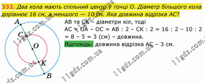 Два кола мають спільний центр у точці О. Діаметр більшого кола дорівнює 16 см, а меншого — 10 см. Яка довжина відрізка АС? АВ та СК – діаметри кіл, тоді АС = ОА – ОС = АВ : 2 – СК : 2 = 16 : 2 – 10 : 2 = 8 – 5 = 3 (см) – довжина. Відповідь: довжина відрізка АС – 3 см.