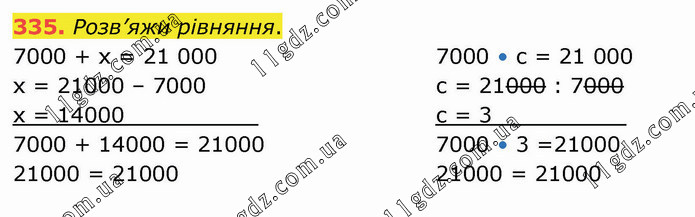 Розв’яжи рівняння. 7000 + х = 21 000 х = 21000 – 7000 х = 14000__________ 7000 + 14000 = 21000 21000 = 21000 7000 • с = 21 000 с = 21000 : 7000 с = 3__________ 7000 • 3 =21000 21000 = 21000