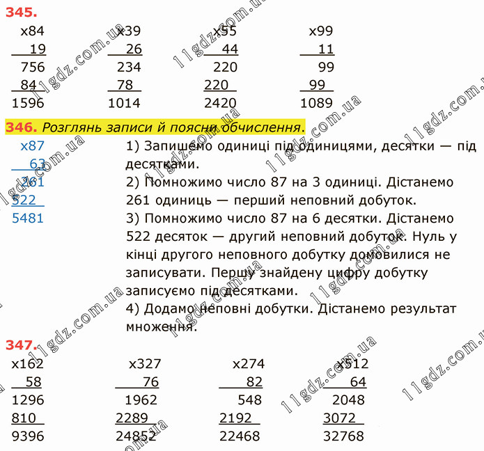 Розглянь записи й поясни обчислення. 1) Запишемо одиниці під одиницями, десятки — під десятками. 2) Помножимо число 87 на 3 одиниці. Дістанемо 261 одиниць — перший неповний добуток. 3) Помножимо число 87 на 6 десятки. Дістанемо 522 десяток — другий неповний добуток. Нуль у кінці другого неповного добутку домовилися не записувати. Першу знайдену цифру добутку записуємо під десятками. 4) Додамо неповні добутки. Дістанемо результат множення.